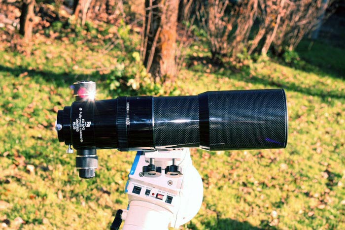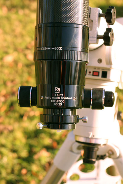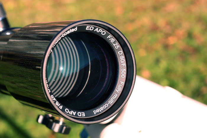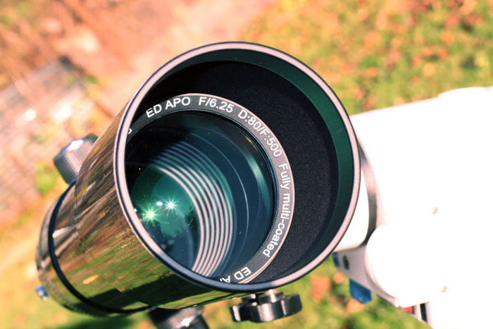 Еще телескоп привлек меня своей компактностью: длина трубы всего 39 см. Но не стоит недооценивать его из-за размеров. Размер объектива небольшой – 80мм, – зато он изготовлен из специального материала, потому изображение в таком телескопе на порядок лучше, чем в обычном рефракторе (ахромате). Потому эта модель (полуапохромат) подходит для проб в астрофотографии.
