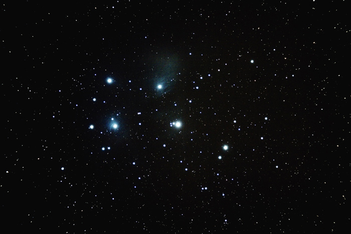 Звездное скопление Плеяды. Серия 15х30сек, ISO 3200, Canon 50d. Обработка в Ирисе, Фотошопе.