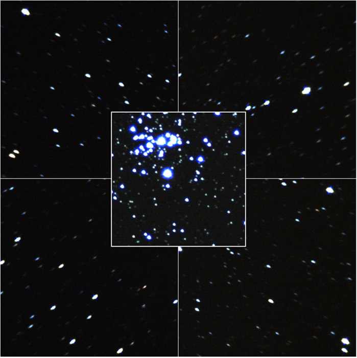 Вид звездного поля на кроп-камере без использования флеттенера. Серия 15х30сек, ISO 1600, Canon 50d. Перекоса плоскости матрицы по отношению к фокусеру не замечено, это радует! Хорошо виден остаточный хроматизм и специфичная форма звезд, о которой я говорил выше. При изменении размера изображения до формата 1200х800 этого не заметно. Что касается остаточного хроматизма, то это так и должно быть – в полуапохроматах хроматизм значительно снижен по сравнению с рефракторами-ахроматами с аналогичным фокусным расстоянием, но все же он не сведен на нет (потому и «остаточный»). Совсем нет хроматизма в полных апохроматах, но это уже телескопы из другой ценовой категории. При визуальных наблюдениях никакого дискомфорта не наблюдается, только при больших увеличениях (160х) звезда иногда меняет форму с круглой на треугольную.