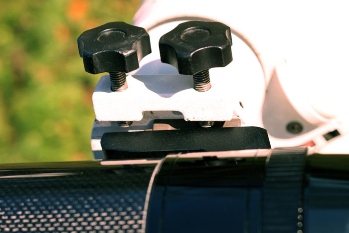 Крепить телескоп к монтировке можно по-разному. Я использовал площадку от фотоштативной головки. Второй винт используется в качестве страховочного, чтобы труба не съехала вниз.