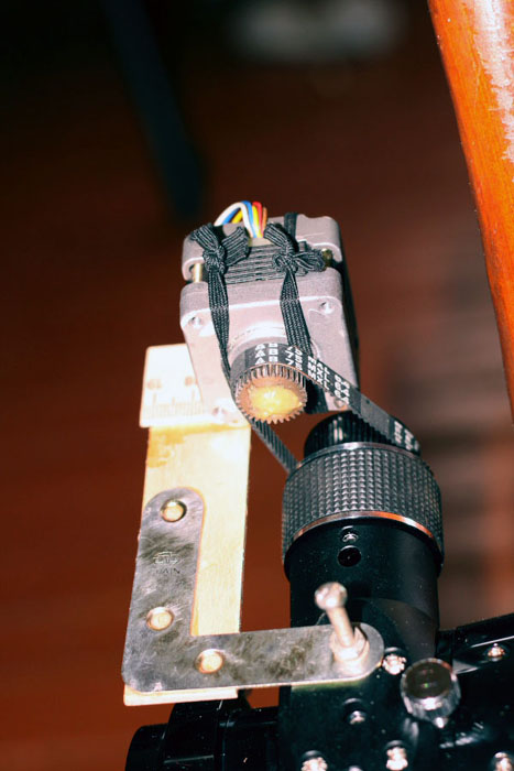 Плавно переходим к тестам. Выше я писал, что на нижней части фокусера имеются отверстия с резьбой для установки движка для автоматической фокусировки. На фото ниже показан вариант крепления шагового двигателя на ручку тонких движений фокусера. Вращение передается через ремень.