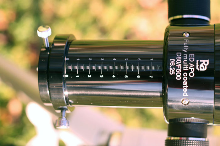 Длина выдвижной части фокусера составляет восемь сантиметров – этого достаточно для окуляров любых фокусных расстояний. Для удобства на поверхности нанесена шкала.