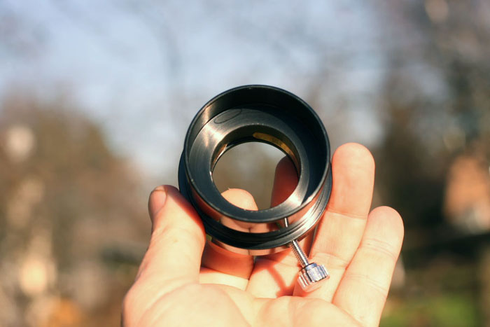 Внутри переходника есть вкладыш из медной пластинки, именно эта пластинка обжимает корпус окуляра, как хомут, при закручивании стопорного винта.