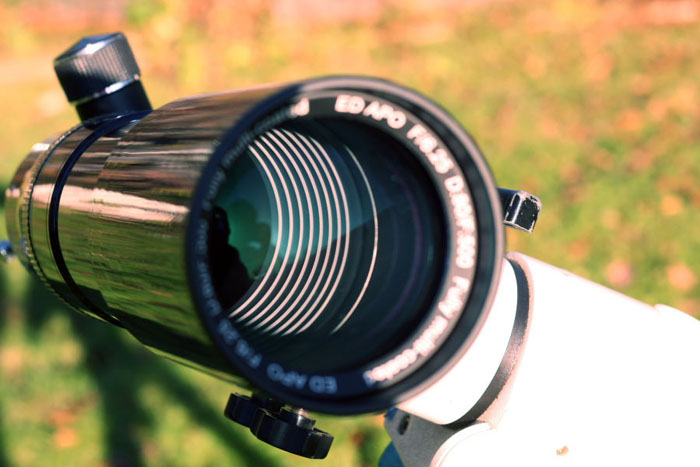 Что ж, посмотрим на главную часть телескопа – объектив. Все параметры телескопа отображены на его оправе. Видно насыщенное многослойное просветление, которое устраняет потери света при прохождении света на границе воздух-стекло. Кстати, на оправе объектива о многослойном просветлении говорит словосочетание «fully multi-coated». Объектив двухэлементный, один из элементов – линза – изготовлен из специального стекла марки ED (extra-low dispersion) со сверхнизкой дисперсией, благодаря которому телескоп дает качественное изображение с минимальными хроматическими аберрациями.